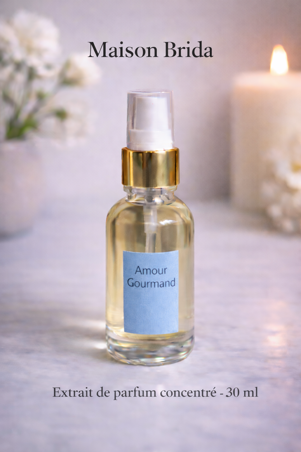 30ml Amour Gourmand est un extrait de parfum intense ,aux notes chaleureuses et sucrées. Une fragrance enveloppante et élégante,
